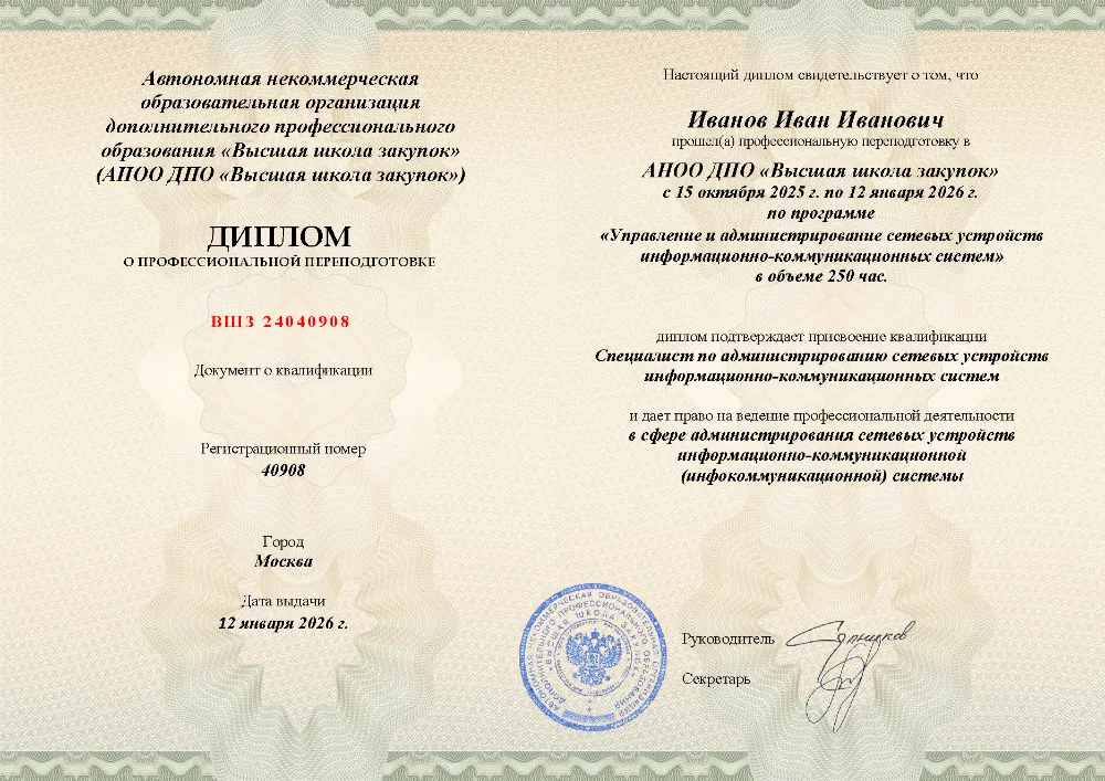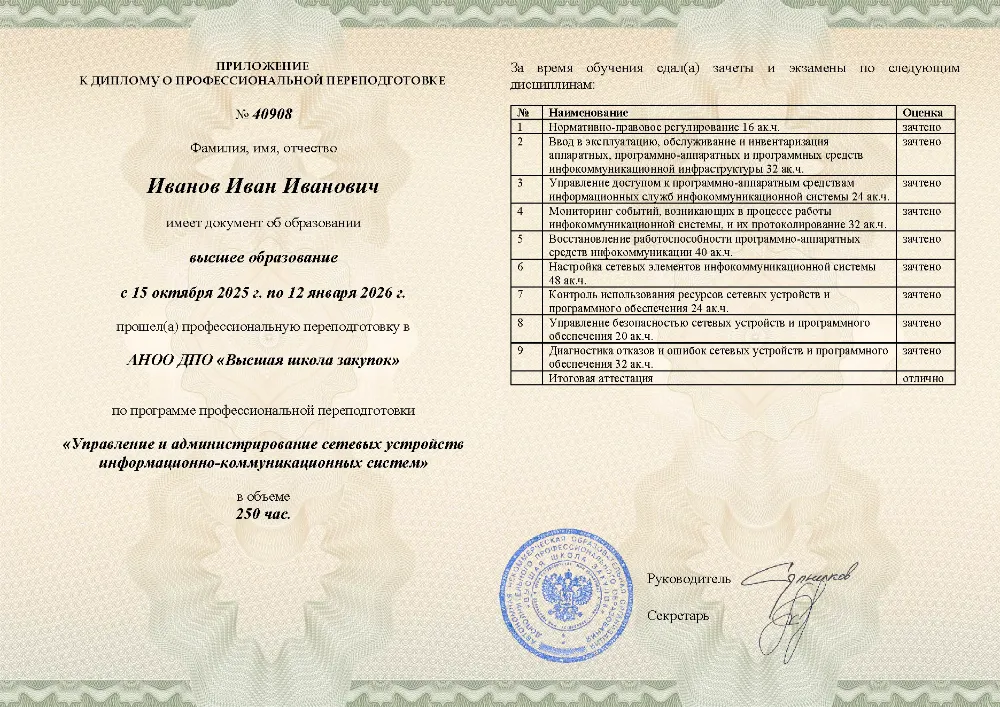 Профессиональная переподготовка, 250 академических часов, 9 модулей: нормативно-правовое регулирование и ввод в эксплуатацию, настройка и мониторинг сетевых устройств, управление доступом и безопасностью, диагностика и восстановление работоспособности инфокоммуникационных систем. Онлайн-обучение в в Вологде с итоговой аттестацией.