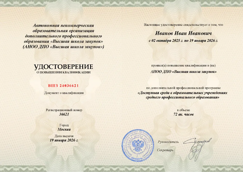 Повышение квалификации, 72 академических часа, 13 модулей: законодательные основы и направления организации доступной среды, паспортизация объектов, особенности работы с обучающимися с ОВЗ, педагогический контроль и методы управления временем педагога. Онлайн-обучение в в Вологде с итоговой аттестацией.