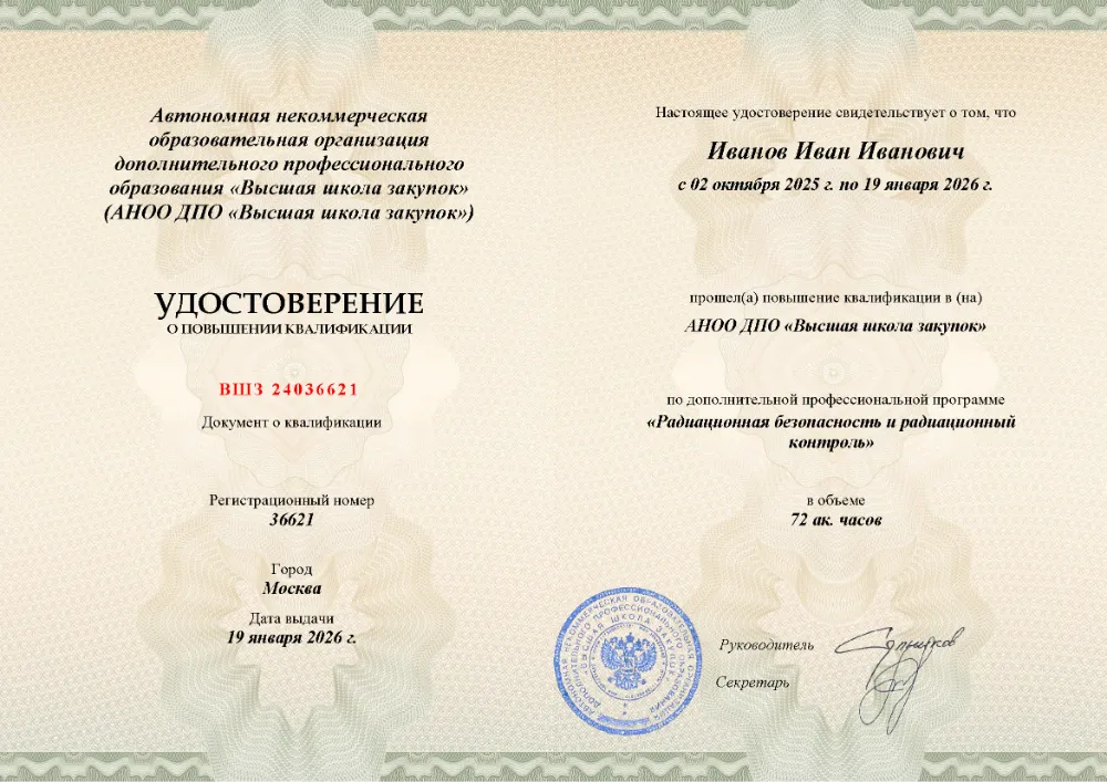 Повышение квалификации, 72 академических часа, 9 модулей: законодательное и нормативное обеспечение, дозиметрия и приборная база, лицензирование, методики радиационной защиты при эксплуатации и обслуживании установок, действия при авариях и ЧС. Онлайн-обучение в в Вологде с итоговой аттестацией.