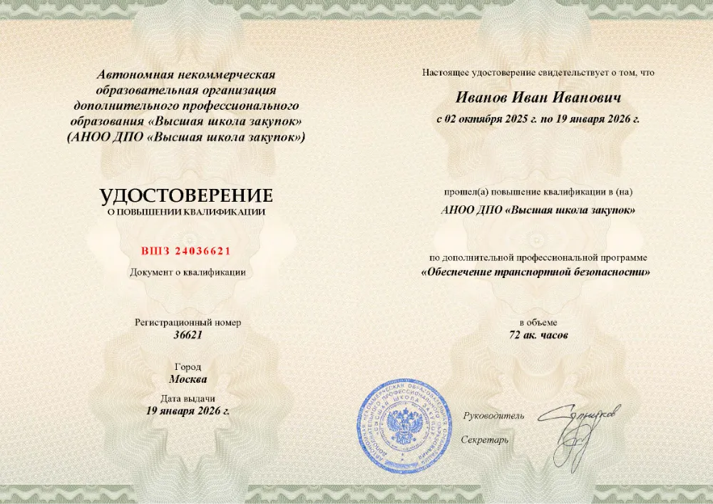 Повышение квалификации, 72 академических часа, 10 модулей: нормативная правовая база и система мер обеспечения транспортной безопасности, планирование и реализация защитных мероприятий, информационное обеспечение и государственный контроль, оценка состояния защищенности объектов. Онлайн-обучение в в Вологде с итоговой аттестацией.